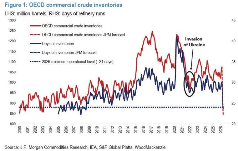 The first chart illustrates that global crude oil stocks were approaching critically low levels, nearing the minimum operational threshold. The second chart provides more significant insights by detailing refined product inventories measured in days. Some nations lack the capacity to fully refine their fuel requirements; for example, the United Kingdom can refine all its petrol domestically but only 30-40% of its demand for diesel, jet fuel, and heating oil. The situation remains complex, for example, the UK has limited LPG reserves but receives Norwegian and North Sea gas via pipelines on a just-in-time basis, with 76% of its gas supply originating from Norway and domestic fields. Fortunately, peak gas usage in the UK has passed as warmer weather reduces demand and boilers are switched off. Nevertheless, pricing is determined globally and genuine shortages in the Far East continue to exert upward pressure. So far, this shock appears manageable, avoiding the widespread manufacturing closures and food price surges seen following the Ukrainian invasion. However, elevated diesel and fertiliser costs are adversely affecting the Northern Hemisphere planting season at a critical moment, which is likely to result in food inflation later this year.