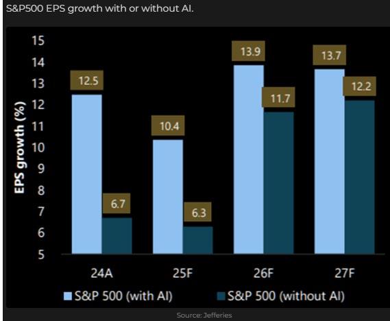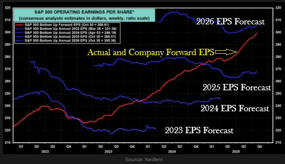 The rotation out of technology and into other sectors is building momentum. The rationale for this shift is that AI stocks have become expensive, although future returns appear promising, there remains considerable uncertainty. For markets, not only the level but also the rate of change in future earnings growth is critical. “The Rest” are now beating expectations, with upward revisions to their future earnings growth figures. As illustrated by the first chart, these sectors are experiencing accelerating earnings expectations while AI growth is plateauing. By 2026 and 2027, analysts forecast the earnings growth of the other sectors to match AI, yet these companies are valued at more than 50% less. The second chart highlights the primary driver of the current bull market, earnings growth. The Blue lines represent historical and forward-looking analysts’ expectations, while the red line shows companies’ own forward projections, which tend to be conservative. Notably, company forecasts for 2025 already exceed analyst expectations for 2026. This pattern reflects analysts’ characteristic caution at this stage of the cycle, resulting in markets being more attractively valued than they may initially appear.