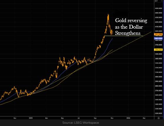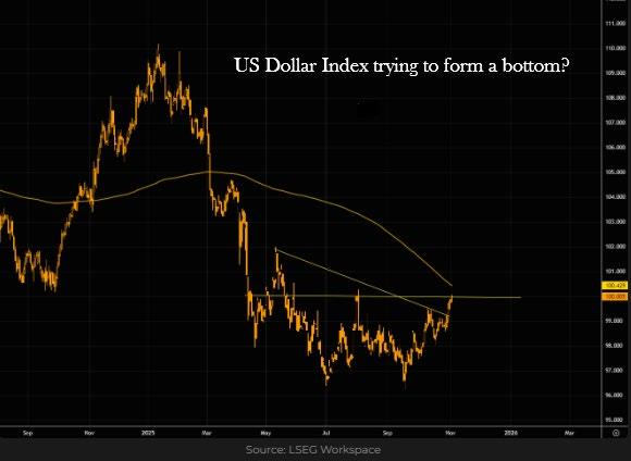 One of the key tenets of Donald Trump’s economic policy is to weaken the US dollar. So far, he and his team have been very successful, as this chart of the DXY index which calculates the dollar against a basket of global currencies (notably the yen and euro) shows. Since the introduction of tariffs, the dollar has been weak. But just recently the dollar seems to have found a steadier level. Partly this can be explained by political issues in Japan and Europe (France) but perhaps also by the US Government shutdown causing turmoil in the short-term money markets. A lack of liquidity means money must go “home” i.e. to the US dollar and US Treasury bonds.