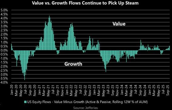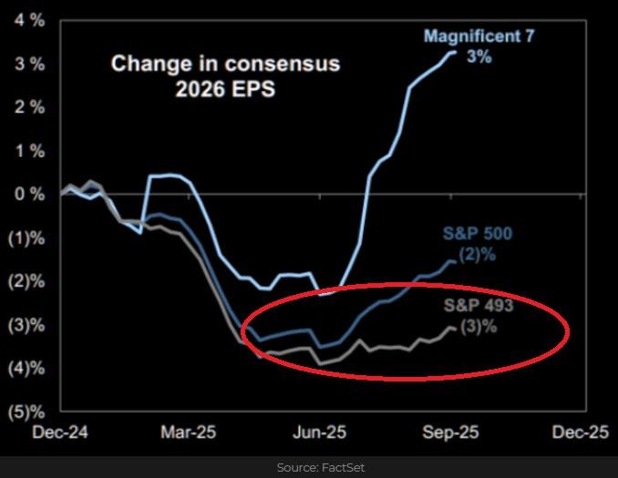 There are a few signs that a rotation out of technology and into other sectors is beginning to gain early momentum. The first chart shows the flow of cash into US equities by share class type. Growth is dominated by Technology, while Value includes Healthcare, Industrials, Consumer Staples, and similar sectors. Since last year, there has been slightly more buying of Value than Growth. So far, this appears to be bargain hunting rather than a strategic asset allocation shift. However, as the second chart shows, we are now seeing a key market driver, earnings growth, for these other sectors just starting to rise. It is still very early days, with the Magnificent 7 continuing to accelerate, but it wouldn’t take much of a slowdown in their earnings for a larger shift in asset allocation to occur.