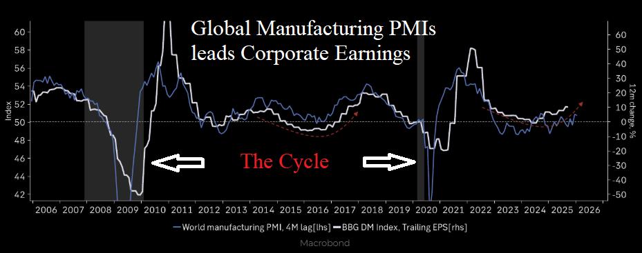 The last cycle was a long one, starting just after the Great Financial Crisis in 2009 and ending when Russia invaded Ukraine and unleashed inflation. The current cycle began when the US Federal Reserve Bank stopped raising interest rates at their meeting in mid-October 2023. This chart shows the rate of change in developed market corporate earnings (key market driver) compared to the global manufacturing PMI indicator. The shaded areas represent recessions. As always, the pattern is remarkably similar: an initial big boost to the percentage change, followed by a steady progression as the cycle expands and develops. The clear message here is that all is normal and there is plenty of time left in this cycle.